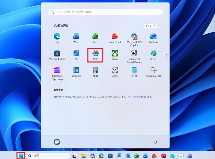 まず、画面中央下のWindowsマークをクリックして「設定」を開きます。