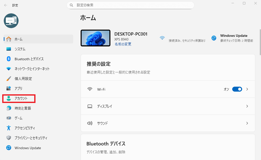 設定画面が開いたら、左側のメニューに「アカウント」という項目があるのでクリックします。