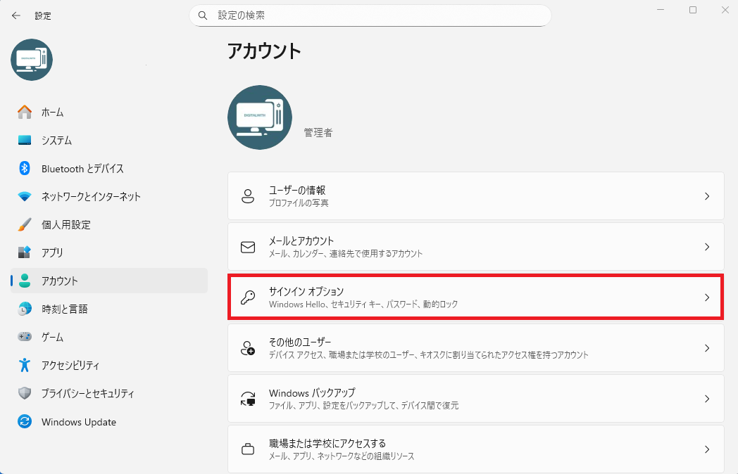 アカウント項目の中に「サインイン オプション」というメニューをクリックします。
