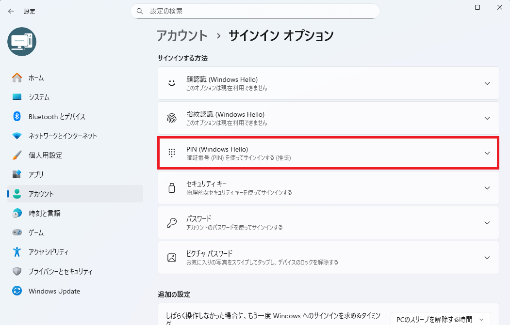 サインインオプションの一覧に「PIN(Windows Hello)」があるのでクリックします。